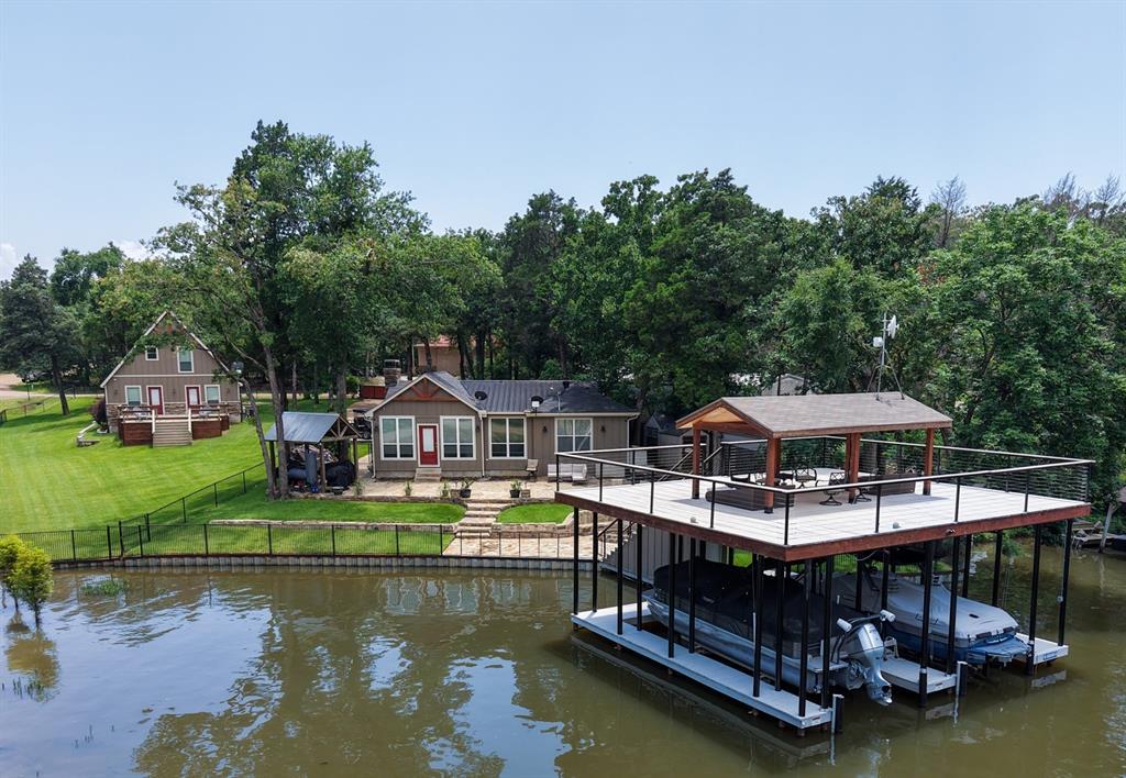Don't miss this rare opportunity to own two charming adjacent waterfront homes on two fully fenced lots, each with its own private electronic gated entrance. Whether you're looking to accommodate extended family, entertain guests, establish a short-term rental income stream, or create a small corporate retreat, this unique setup offers exceptional flexibility and value. The main home, gutted and remodeled in 2017, spans 1,629 square feet with three bedrooms and two bathrooms. It features a spacious living area highlighted by a stacked stone fireplace, wood beam ceilings, a generous dining area, and a versatile flex room ideal for an office, hobby space, or exercise room. The second home, constructed in 2019, offers 1,400 square feet, also with three bedrooms and two bathrooms. Far more than a guesthouse, just like the main home it includes a full kitchen complete with granite counter tops, stainless steel dishwasher, refrigerator, range, microwave, and a well-sized utility room with full-size washer and dryer. Both homes boast serene views of a protected cove, with outdoor spaces that include either a large waterside deck or a flagstone patio perfect for relaxing or entertaining. A double-slip boathouse accommodates two boats, while the expansive party deck, partially covered for shade, provides an ideal vantage point to enjoy peaceful cove views. Set on half an acre with 172 feet of waterfront, the property offers abundant concrete parking and space to add a garage. Lake pump sprinkler system keeps the lawn and landscaping lush and beautiful. Both homes are offered mostly furnished with only a few exclusions, making this turnkey opportunity even more appealing.