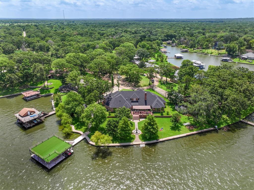 Experience the best of lakeside living with over 300 feet of protected, deep-water frontage on a wide cove. This impeccably maintained one-story home offers water views from nearly every room, plus a spacious bonus room with half bath over the garage—ideal for a 5th bedroom, bunkroom, or game room. Inside, enjoy an open living area with hand-scraped hardwoods, 12' doors, and a cozy fireplace. The chef’s kitchen features granite countertops, a large island, Thermador gas cooktop, and double ovens. Additional highlights include a formal dining room, breakfast nook, office with built-ins, and a wine cellar that doubles as a secure tornado shelter. Built with quality and efficiency in mind—foam insulation, post-tension slab, tankless water heater, DSL, and whole-house WiFi. Outside, enjoy an oversized 3-car garage, 2 storage sheds, and a deep-water boathouse with 2 full slips, a PWC slip, and a party deck. Furnishings negotiable—bring your boat and start living the lake life!