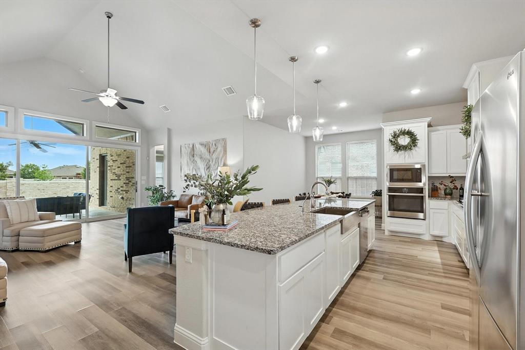 ***Hot New Price*** Massive Sliding Glass Doors, Welcome to this beautifully designed Oversized One story home in the prestigious Trinity Falls master planned community, ideally located just off Highway 75 and minutes from 121. This very open modern design is a 4-3-2 one story home that includes a dedicated study, formal dining, and game room, offering both space and flexibility for today’s lifestyle. Enjoy striking curb appeal with mature landscaping, a charming covered front porch, and a classic brick elevation. Inside, the impressive foyer greets you with tray ceilings and rich wood flooring, setting the tone for the elegant design throughout. The open concept family room features vaulted ceilings and flows seamlessly into the chef’s kitchen, complete with an oversized island, granite countertops, stainless steel appliances, a gas cooktop, custom backsplash, and walk-in pantry. Massive sliding glass doors flood the home with natural light, connecting indoor-outdoor living together. The split bedroom layout ensures master bedroom privacy, with the spacious primary suite offering a sitting area and direct access to the backyard. The luxurious primary bath includes dual vanities, a soaking tub, a walk-in shower, and a generous closet. Step outside to a private backyard built for entertaining, featuring an extended covered patio, a gas fireplace, and ample room for outdoor living. Additional features include energy-efficient upgrades like a tankless water heater, radiant barrier, Low E Windows, and the benefit of the remaining builder warranty.