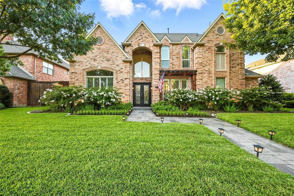 Stunning luxury home with exceptional curb appeal and multiple outdoor living areas. Behind the striking double iron-and-glass front doors, hardwood floors lead through an inviting entry accented by modern iron balustrades and an updated chandelier. The formal dining room is perfect for gatherings large or small. The adjacent office or living room showcases a marble fireplace, architectural windows on both north and south walls, and glass French doors for privacy and a transom for added light and openness. The kitchen is a true showpiece. It features marble countertops, white Shaker cabinetry, and top-of-the-line Wolf appliances, including a six-burner gas range with griddle, double oven, and commercial-grade vent hood. Additional highlights include a Kohler farmhouse sink with Moen faucet. The adjacent breakfast room has a built-in china cabinet with a Sub-zero wine refrigerator. The kitchen opens seamlessly into a warm family room with a beamed ceiling, built-in cabinetry, gas fireplace, and wet bar with marble counters and wine storage. The primary suite offers a serene retreat with hardwood flooring, remote-controlled blinds, and French doors leading to a private patio. The spa-inspired bath includes marble counters, shower with dual showerheads, a whirlpool tub with air massage, smart mirrors, and a custom-designed closet with extensive storage and locking drawers. The second bedroom downstairs is split from the master to make a perfect guest room or nursery. Upstairs, you’ll find a spacious game room, two additional bedrooms with walk-in closets, and a shared updated bath. Outdoors, enjoy resort-style living with all-synthetic turf, a covered patio with cedar pergola, built-in grill, fireplace, and a plunge pool with whirlpool jets and water feature. Every system has been meticulously updated—from attic ventilation and gutter screens to freshly painted interiors (2025)—ensuring a move-in-ready masterpiece of comfort, elegance, and modern luxury.